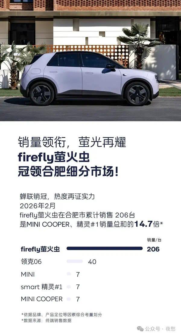近日,公众号“夜愁”发布2026年2月合肥地区高端精品小型车细分市场销量数据,蔚来旗下萤火虫在该区域单月销量达206台,表现大幅领先宝马MINI COOPER、smart精灵#1等同级车型,二者销量总和仅为萤火虫的1/14.7。