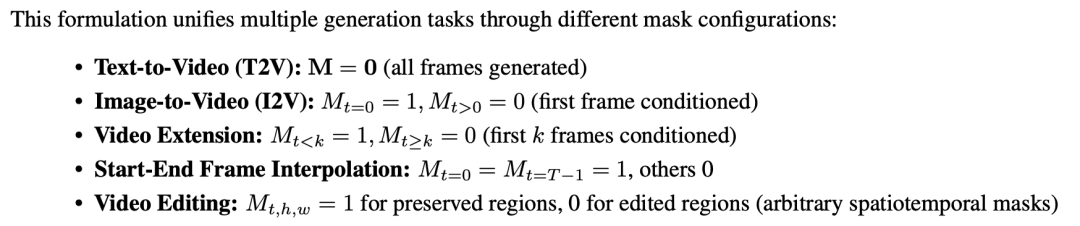 通道维度上,把带噪视频、条件帧、遮罩叠在一起,不管文生视频、图生视频、视频延长还是局部编辑,本质上都变成“带掩码的修复类”任务。