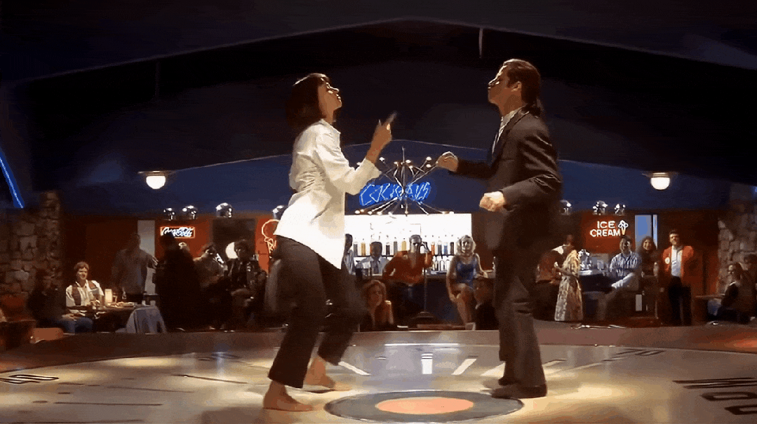 再看一眼原视频(来自昆汀电影《低俗小说》片段):噢~俩人在跳舞,女生在左边,男生在右边,他们原来是这么跳的。