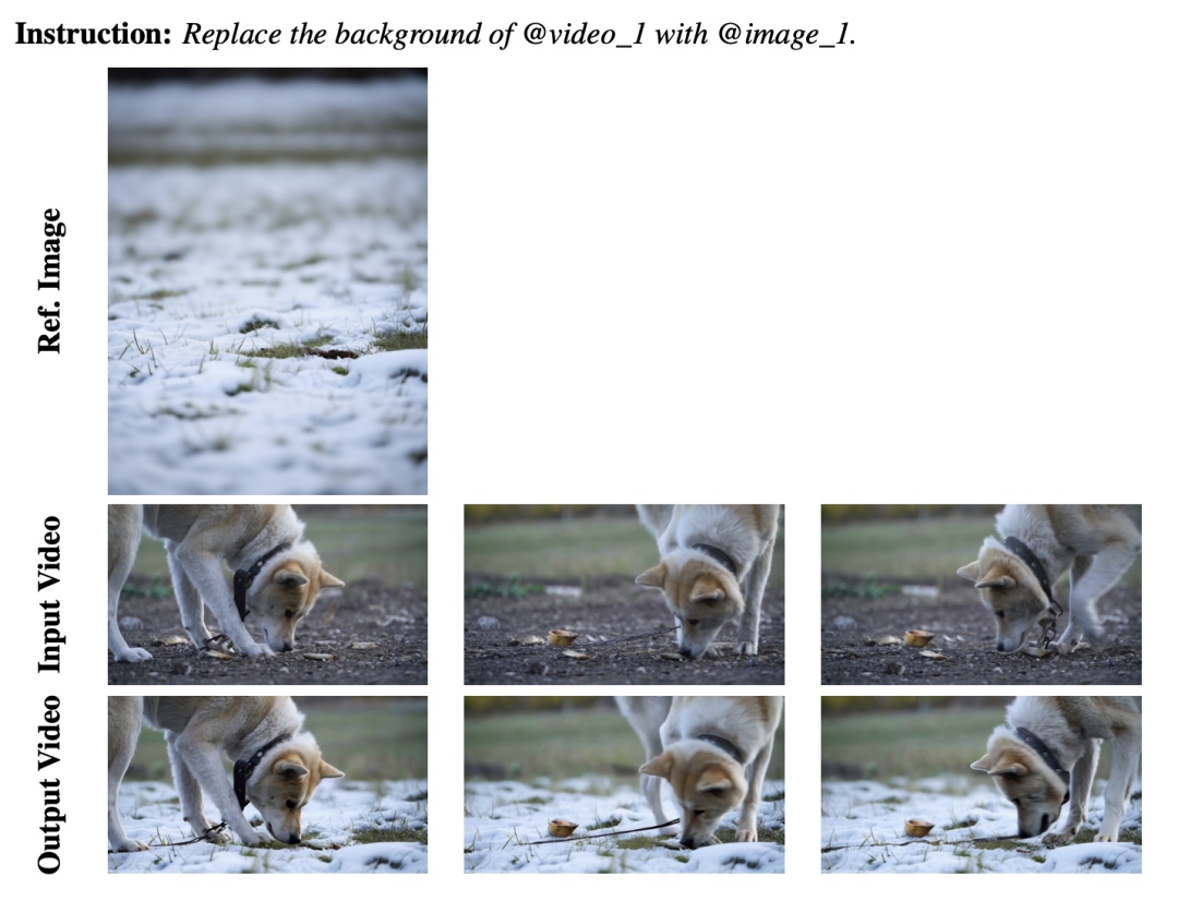 基于参考图像的风格迁移与主体保留:就拿上面参考的狗和猫图像来说,从毛色、体态到身形大小的细节,都被精准保留并迁移到了视频人物身上;