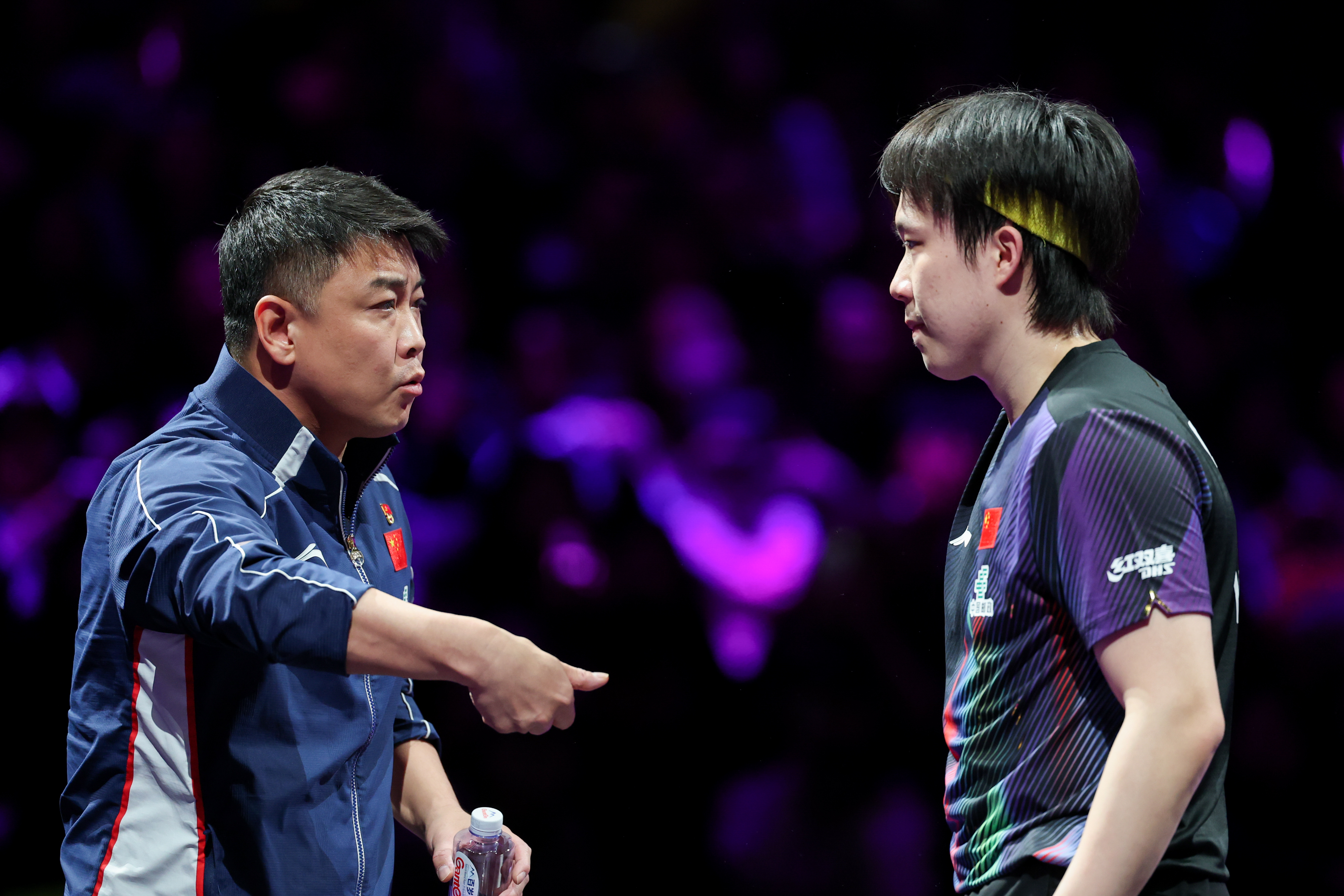 3月14日,教练王皓(左)在比赛间隙指导王楚钦。