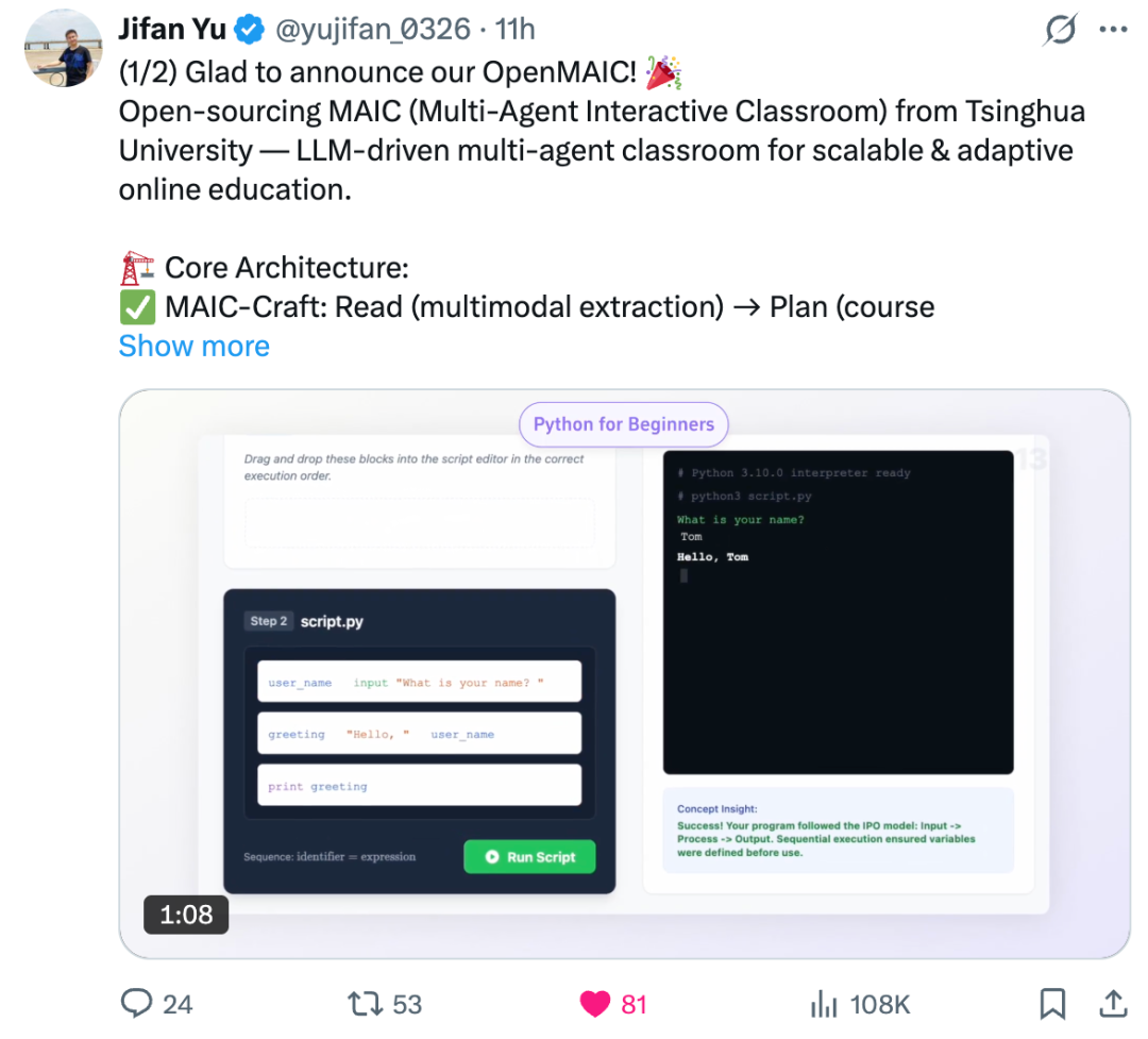 它就是 OpenMAIC,一个刚刚开源、由清华大学研究团队历经 2 年打磨的 AI 课堂平台,现在已经可以免费体验。该项目开源仅数小时,X 上已经引发了十几万人关注。